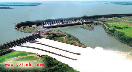 伊泰普水電站位于巴西與巴拉圭之間的界河——巴拉那河(世界第五大河,年徑流量7250億立方米)上,伊瓜蘇市北12公里處,是當今世界裝機容量第二大,發(fā)電量最大的水電站。(裝機容量最大的是長江三峽水電站,總裝機容量將達到2250萬千瓦,年發(fā)電量為900億度左右。)由巴西與巴拉圭共建,發(fā)電機組和發(fā)電量由兩國均分。