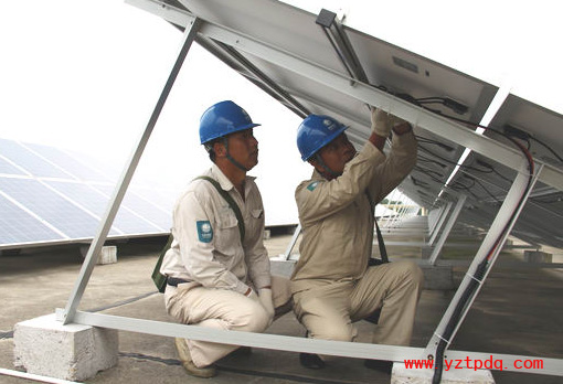 2014年9月16日,國網(wǎng)揚州市江都供電公司工作人員深入基層,來到“江蘇光伏賣電第一人”朱啟杰以及其他分布式光伏發(fā)電用戶,為他們解決光伏發(fā)電和并網(wǎng)中遇到的問題,促進江都分布式光伏發(fā)電產(chǎn)業(yè)的快速發(fā)展。目前,揚州市江都區(qū)有32家分布式光伏發(fā)電用戶申請并網(wǎng),已經(jīng)并網(wǎng)20家,其中企業(yè)為3家,個人為17家,并網(wǎng)總容量為310千瓦,在江蘇省各縣(市、區(qū))名列前茅。圖為江都供電公司員工為揚州永力電子公司120千瓦分布式光伏發(fā)電裝置檢修線路。