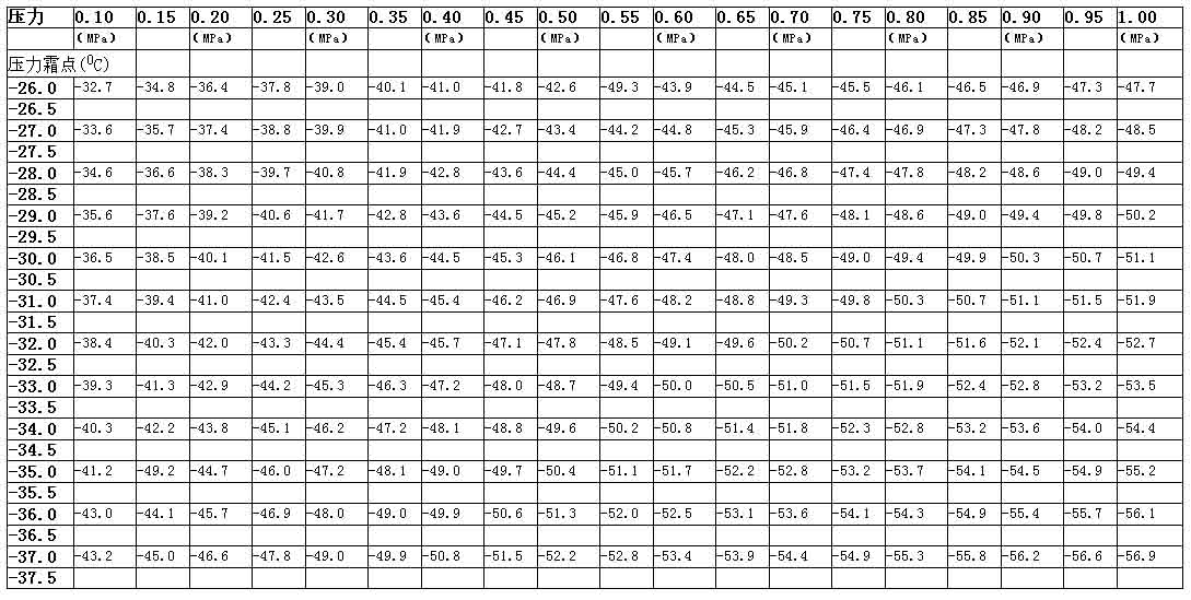 注明:1)第一列中的壓力霜點(diǎn)即為低溫露點(diǎn)儀的讀數(shù)。根據(jù)露點(diǎn)有關(guān)理論,當(dāng)露點(diǎn)溫度小于零度時(shí),稱之為霜點(diǎn)。