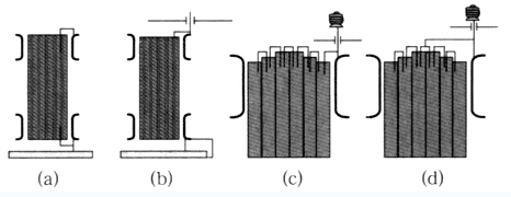 鐵芯接地方式如圖1所示。圖1中(a)是一種最簡單的接地方式,在油箱內(nèi)部完成,在同一側(cè)的上軛和下軛插入接地銅帶,上軛接地片與上夾件相接,下軛接地片與下夾件相接再與墊腳相接而接地,上夾件是通過鐵芯而接地的。這種方式多用于中等容量或較小容量的變壓器。圖1中(b)是鐵芯接地片與上夾件連結(jié),然后經(jīng)套管引出油箱外部再接地,下夾件與墊腳經(jīng)箱底接地,鐵芯與油箱間是絕緣的,這種結(jié)構(gòu)的上夾件不能與油箱接觸。圖1中(c)和(d)均用于鐵芯總厚度很大的大型變壓器,這種變壓器往往在疊片組中每隔一定厚度放置一層油隙,以改進(jìn)散熱性能,或每隔一定厚度墊一層絕緣紙以降低渦流損耗。這時(shí)鐵芯被隔開成若干組,切斷了電容接地的路徑。為求得電位的盡可能均勻,要把各個(gè)被隔開的片組用∩形銅帶串聯(lián)起來。如鐵芯厚度很大時(shí),采用(d)方式,即由中央部分接地,可使電位更均勻些。