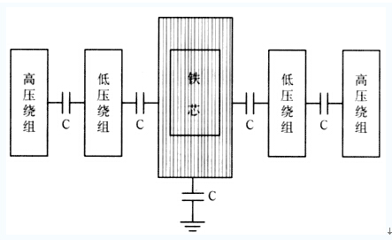 在變壓器正常運(yùn)行中,帶電繞組及引線與油箱間構(gòu)成的電場(chǎng)為不均勻電場(chǎng),鐵芯和其它金屬構(gòu)件就處于該電場(chǎng)中。圖2示出了變壓器鐵芯不接地時(shí)的斷面示意。由圖2可見,高壓繞組與低壓繞組之間、低壓繞組與鐵芯之間、鐵芯與大地(變壓器油箱)之間都存在著寄生電容,帶電繞組將通過寄生電容的耦合作用使鐵芯對(duì)地產(chǎn)生一定的電位,通常稱為懸浮電位。由于鐵芯及其它金屬構(gòu)件所處的位置不同,具有的懸浮電位也不同,當(dāng)兩點(diǎn)之間的電位差達(dá)到能夠擊穿其間的絕緣時(shí),便產(chǎn)生火花放電,這種放電是斷續(xù)的,放電后兩點(diǎn)電位相同,但放電立即停止,然后再產(chǎn)生電位差,再放電……。斷續(xù)放電的結(jié)果使變壓器油分解,長期下去,逐漸使變壓器固體絕緣損壞,導(dǎo)致事故發(fā)生。為避免上述情況發(fā)生,國標(biāo)規(guī)定,變壓器鐵芯和較大金屬零件均應(yīng)通過油箱可靠接地,20 000 kVA及以上的變壓器,其鐵芯應(yīng)通過套管從油箱上部引出并可靠接地。具體做法是將變壓器鐵芯與變電站的接地系統(tǒng)可靠連接。這樣,鐵芯與大地之間的寄生電容被短接,使鐵芯處于零電位,這時(shí)在地線中流過的只是帶電繞組對(duì)鐵芯的寄生電容電流。對(duì)三相變壓器來說,由于三相結(jié)構(gòu)基本對(duì)稱,三相電壓對(duì)稱,所以三相繞組對(duì)鐵芯的電容電流之和幾乎等于0。