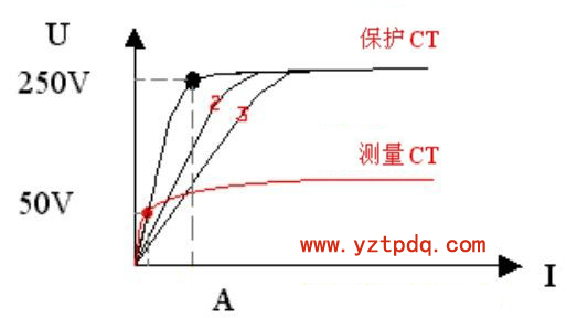 2、測(cè)得的伏安特性曲線與過去或出廠的伏安特性曲線比較,電壓不應(yīng)有顯著降低。若有顯著降低,應(yīng)檢查二次繞組是否存在匝間短路。當(dāng)有匝間短路時(shí),其曲線開始部分電流較正常的略低,如圖中曲線 2、3 所示(指保護(hù) CT 有匝間短路,曲線 2 為短路 1 匝,曲線 3 為短路 2 匝),因此,在進(jìn)行測(cè)試時(shí),在開始部分應(yīng)多測(cè)幾點(diǎn)。