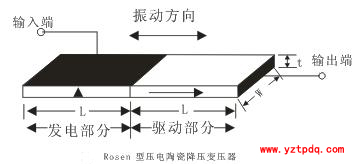 整個壓電變壓器可以分成兩部分:下半部分沿厚度方向極化且沿徑向應變,作為輸入端,稱為驅動部分;上半部分也沿厚度方向極化且沿徑向應變,作為輸出端,稱為感應部分。當正弦交變電壓加到輸入端時,壓電變壓器產生沿徑向振動;而感應部分通過正壓電效應,產生電壓輸出。