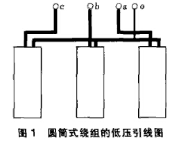 對于小型配電變壓器,例如500kVA及以下的產品,低壓為圓筒式繞組,y接線在繞組的上部(見圖1)。中性點引線很短,雖然設計規(guī)定引線設計按25%額定電流設計,但在實際制造中,有的與其它引線相同,有的截面略小,因此中性點引線電阻所占比例不大,測線電阻、相電阻能滿足標準要求。