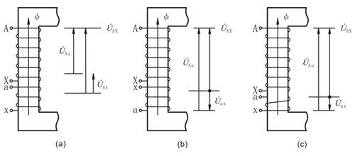 電力變壓器或互感器均存在多個繞組,多個引出端子,為了說明繞在同一鐵芯上的兩個繞組的感應電動勢的相對關系采用了“極性”這一概念。同一鐵芯上的電力變壓器繞組有同一磁通流過,兩繞組若以同側線端為起始端,電力變壓器繞組向相同,則感應電動都方向相同;繞向相反,則感應電動勢方向相反。所以電力變壓器繞組的繞向和端子標號一經確定,就可以用“加極性”和“減極性”來表示兩個繞組之間的感應電動勢的關系。在圖1-1(a)中,兩繞組繞向相同,在同一磁通穿過時,兩繞組內的感應電動勢在同名端子間任何瞬間都有相同極性,此時一、二次電壓?ax和?ax相位相同,如連接X和x,?Aa等于兩電壓差,則該電力變壓器的兩繞組就為“減極性”關系。如將二次繞組標號交換[見圖1-1(b)所示],顯然同名端子間的電動勢將變成相反方向,電壓相位差為180°,這時連接Xx后,?Aa是?ax與?ax之和。則電力變壓器此兩繞組之間是“加極性”關系。同理,在圖1-1(c)中,保持圖1-1(a)中的繞組標號。而將ax繞組繞向改變,則電力變壓器 兩繞組又成了”加極性“關系。