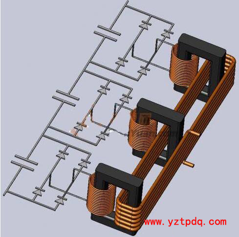 多變壓器共初級次級級聯(lián)方式的電路示意圖如下圖所示。為了能看的直觀一些,這里畫了一張3D的圖紙,為了畫出這個示意圖,畫了好長時間,特別是初級的那個線圈,看上去簡單,很費了一番力氣!這種結構的特點是多個變壓器組合,初級為串聯(lián)結構,次級獨立整流以后再串聯(lián)。優(yōu)點是:適合大功率的輸出,變壓器的升壓比不大。缺點是:初、次級對磁芯之間總有一個絕緣要求高,需要多個變壓器。