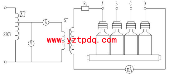 3) 對(duì)于串聯(lián)間隙組合式過電壓保護(hù)器,應(yīng)進(jìn)行工頻放電電壓試驗(yàn),試驗(yàn)接線如下圖所示。試驗(yàn)時(shí)在保護(hù)器 A、B、C、D 兩兩端子之間分別施加工頻電壓,調(diào)節(jié)自耦變壓器ZT,緩慢加壓,觀察安培表 A 的電流變化。當(dāng)安培表 A 的電流突然增大時(shí),表示間隙電極放電,記錄此時(shí)電壓表 V 的電壓值,此值即為工頻放電電壓在變壓器原邊的數(shù)值,此值乘以升壓變壓器ST 的變比,即為該兩相的工頻放電電壓值。由于放電電極允許有一定的分散度,以及測(cè)試方法的差異,現(xiàn)場(chǎng)測(cè)試值不應(yīng)超出出廠試驗(yàn)值的 20%。如果超出該范圍,應(yīng)停止運(yùn)行,及時(shí)通知廠家處理。