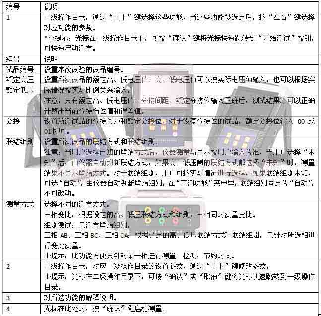 對(duì)于具有多個(gè)分接位的變壓器,輸入額定高、低壓電壓值、分接間距、額定檔位,是為了使測(cè)試結(jié)果可以自動(dòng)計(jì)算出誤差值,以及分接開關(guān)所處的分接位。