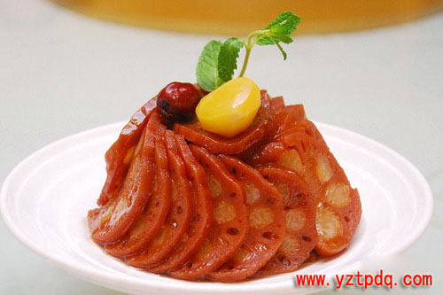 蜜餞捶藕為揚(yáng)州寶應(yīng)十大名菜之首,曾載入清宮御食譜。它是用荷藕、糯米、蜜餞、白蓮為主原料,配以青梅、桔餅、蜂蜜等佐料,經(jīng)燜、拍、炸、蒸等10多道工序制作而成。它色澤醬紅,香甜酥爛,素而不淡,濃而不膩,有健脾開(kāi)胃、生津止渴、減肥降壓、益腎固精之功效。藕片軟糯,食之香甜不膩。