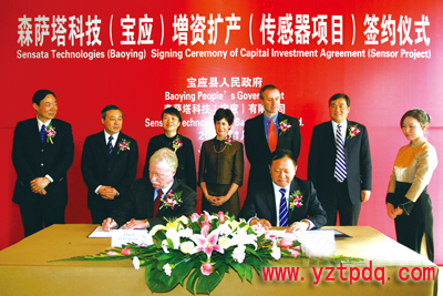 1月19日中午,美國森薩塔科技公司在揚(yáng)州與我縣簽訂增資擴(kuò)產(chǎn)協(xié)議,市委書記、市人大常委會主任王燕文,市委副書記、市長謝正義,副市長聞道才,森薩塔科技總裁兼首席運(yùn)營官瑪莎·蘇利文女士,森薩塔科技執(zhí)行副總裁、首席財(cái)務(wù)官杰夫·科特先生,森薩塔科技運(yùn)營高級副總裁迪克·丁先生,縣委書記、縣人大常委會主任仲生,縣委副書記、縣長王庭國,縣委副書記周玉寶,副縣長顧長榮以及市經(jīng)信委、商務(wù)局、質(zhì)監(jiān)局、海關(guān)、商檢局和我縣相關(guān)負(fù)責(zé)人等出席簽約儀式。