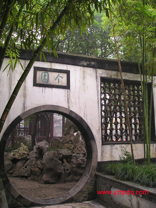 個(gè)園是一處典型的私家住宅園林。從住宅進(jìn)入園林,首先映入眼簾的是月洞形園門(mén)。門(mén)上石額書(shū)寫(xiě)“個(gè)園”二字,“個(gè)”者,竹葉之形,主人名“至筠”,“筠”亦借指竹,以為名“個(gè)園”,點(diǎn)明主題。園門(mén)兩側(cè)各種竹子枝葉扶疏,“月映竹成千個(gè)字”,與門(mén)額相輝映;白果峰穿插其間,如一根根茁壯的春筍。主人以春景作為游園的開(kāi)篇,想是有“一年之計(jì)在于春”的含意吧!透過(guò)春景后的園門(mén)和兩旁典雅的一排漏窗,又可瞥見(jiàn)園內(nèi)景色,樓臺(tái)、花樹(shù)映現(xiàn)其間,引人入勝。進(jìn)入園門(mén)向西拐,是與春景相接的一大片竹林。竹林茂密、幽深,呈現(xiàn)生機(jī)勃勃的春天景象。
