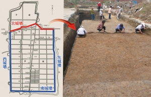 唐羅城北城墻位置確定,留有后期擴建跡象。在考古現場,大小兩條探溝清晰可見,在地表向下40厘米左右的地方,一段古城墻遺址輪廓分明,但由于早些年磚瓦廠取土對城墻造成了嚴重破壞,僅留下基礎部分。夯窩、城墻磚、基槽……考古人員參照史料以及現場考古,發(fā)現東風磚瓦廠附近為唐羅城東北角,這段東西走向的古城墻確為唐代羅城北城墻東段,而整個唐羅城北城墻東起東風磚瓦廠,向西延伸,北折與子城東南角相接,全長1470米。