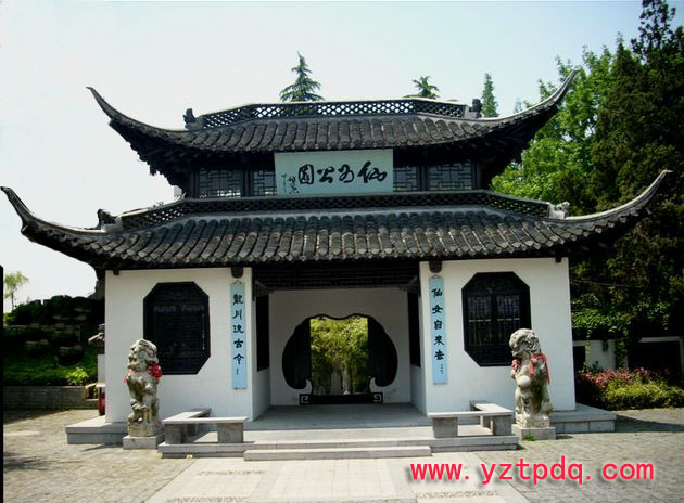 門廳與牌坊同處一條中軸線上,形為如意,游客一入園,即游園如意。進門廳先是一小園,園中,以太湖石依地勢堆疊成花臺,幾株翠竹點綴其間,恰到好處。園門—亡古篆“游仙”二字映入眼簾。進入園門,西部五疊泉,一支“玉液”從假山頂端跌落,出水處似為龍頭。水流不斷,水濺石響,如聞琴韻,泉旁山黃樹綠,溪旁仙女雕像亭亭玉立,淡裝,素裹,冰清玉潔。溪邊綠柳吻水,花木蔥蘢,把仙女映襯得楚楚動人。