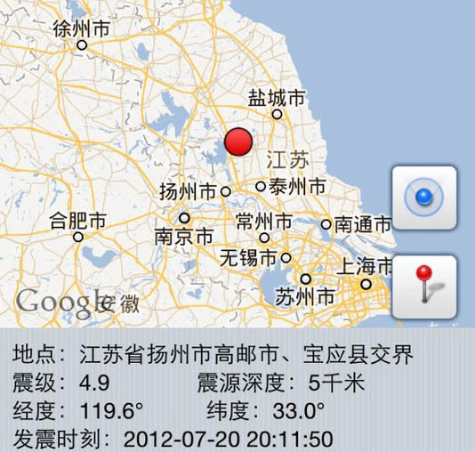 據(jù)揚州市地震臺網(wǎng)中心測定,2012年7月20日20時11分在揚州高郵、寶應(yīng)交界(北緯33.0度,東經(jīng)119.6度)發(fā)生4.9級地震。