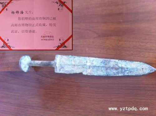 河里找到古代寶劍的消息不脛而走,鄰居和朋友都趕過來“看稀奇”,有人出高價跟楊錦海購買,但他沒有答應。楊錦海心想,挖來的文物,歸國家所有,自己販賣會犯法的。他思前想后,決定把劍捐贈給國家。9月3日,楊俊熙的爸爸楊錦海專程把這把劍送到了高郵市文物局。