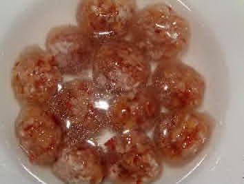 做藕粉圓子首先是制作圓子餡。將花生仁、芝麻仁、核桃仁炒熟焙干分別碾成細(xì)末。將紅棗或大棗煮爛去皮,加糖熬成糖泥后,分別與上述三種仁末同拌,做成小丸,成花生、芝麻、核桃餡料丸。將干藕粉散放在竹匾內(nèi),取丸餡在匾中滾動(dòng),粘上藕粉,取出,噴灑上微水,再入藕粉匾中滾過(guò),再取出,再?lài)娝?,再滾過(guò),直至藕粉圓子坯大小適當(dāng)為好。也有人將圓子生坯沸水內(nèi)一過(guò),再入匾中滾藕粉增大。后者方法做圓子雖快,但圓子表面粗糙,大小也難以一致。做藕粉圓子的高手所做出的藕粉圓子看上去大小一樣,表面光滑,賞心悅目。吃到口里是軟、綿、糯、香。下藕粉圓子并不復(fù)雜,和下普通圓子基本相似。鍋內(nèi)藕粉圓子在沸湯中浮起后,再加入一點(diǎn)冷水,再待湯沸鍋中的圓子全部上浮,呈半透明狀,圓子起暗紅色,即可用漏勺撈出盛到配有桂花糖鹵的碗中上席。