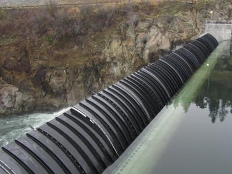 氣盾壩,是一種新型的擋水結(jié)構(gòu),其兼具橡膠壩和鋼閘門的優(yōu)點(diǎn),剛?cè)岵?jì),該結(jié)構(gòu)由美國(guó)0HI公司于20世紀(jì)90年代研制而成.其結(jié)構(gòu)主要由盾板、充氣氣囊及控制系統(tǒng)等組成。利用充氣氣囊支撐盾板擋水,氣囊排氣后塌壩,氣囊臥于盾 板下,可避免河道砂石、冰凌等對(duì)壩袋的破壞;氣囊內(nèi)填充介質(zhì)為氣體,塌壩迅速:各個(gè)部件均為預(yù)制部件,安裝工期短;盾板及氣囊模塊化,便于修復(fù)。